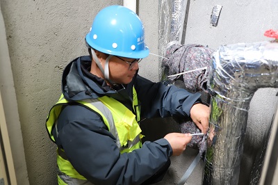 他是維修員張棟棟。背著沉重的工具包,他穿梭在大街小巷,寒風凜冽,腳步不歇,在狹小的管道井、在沒有電梯的樓梯間……他細致地檢查管道,包裹保溫材料,用腳步丈量責任,以實干詮釋擔當。“每一層的水表箱,我們都要對保溫棉、表套等進行檢查,并做好記錄。遇到雨雪冰凍天氣,我們還會增派人員,加大巡檢力度。”寒潮來臨前,公司全體維修員不畏嚴寒,爭分奪秒,對小區管道井、水表箱進行全面檢查和維護,每一處細節都不放過,一旦出現供水故障,他們會迅速組織人員搶修,以最快速度恢復供水。 “您好,聯合水務宿遷供水公司,您請講。”
