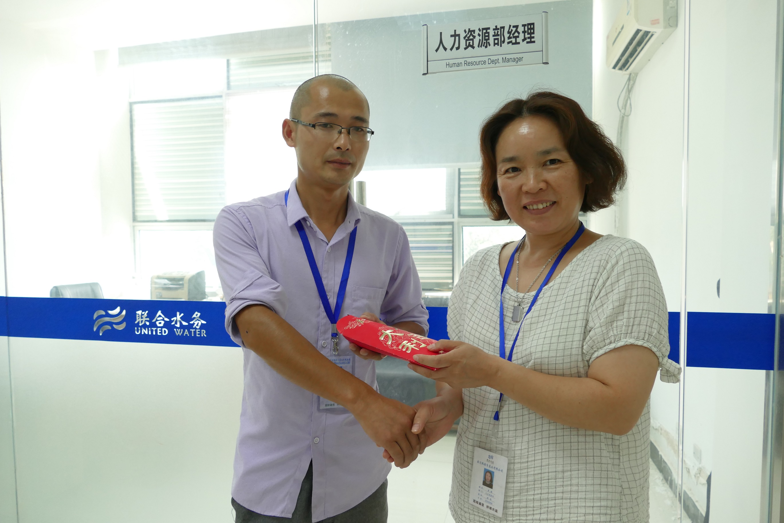 聯(lián)合水務集團董事長兼總裁俞偉景先生得知此情況,立即做出批示:要求在宿遷公司及全集團各兄弟公司發(fā)出捐款號召,愛心接力,并承諾聯(lián)合水務集團兜底,捐款不足部分,由集團公司補足,確保聯(lián)合水務的員工有足夠的錢為其母親支付全額醫(yī)療費。倡議一經發(fā)出,聯(lián)合水務集團董事長兼總裁俞偉景先生、高級副總裁劉猛先生、陳樵先生、JamesBeeson先生,副總裁羅斌先生率先垂范捐款獻愛心,近千名聯(lián)合水務人積極響應, 9070元,7500元,5080元,5000元……一筆筆捐款帶著家人般無限的愛與關懷,自全國各地項目公司飛越千山萬水匯聚到宿遷。短短三日,全集團共籌集愛心款73577元,超出了6萬元的募集金額一萬多元,為張用雷一家雪中送炭,為這個身陷病痛困境的家點燃了希望之光、撐起了一方愛的藍天。當宿遷公司人力資源部經理吳銘將愛心滿滿的捐款遞交給張用雷的時候,他難掩激動,雙眼濕潤。目前,張用雷的母親已在愛心款的幫助下順利完成了手術,轉入康復期。為表達深深的感激之情,張用雷代表他的母親給公司寫了一篇長長的感謝信,他說,再多的文字都道不盡這份刻骨銘心的感激之情,以后他一定努力工作,報答聯(lián)合水務集團和所有同仁們的深情厚誼。